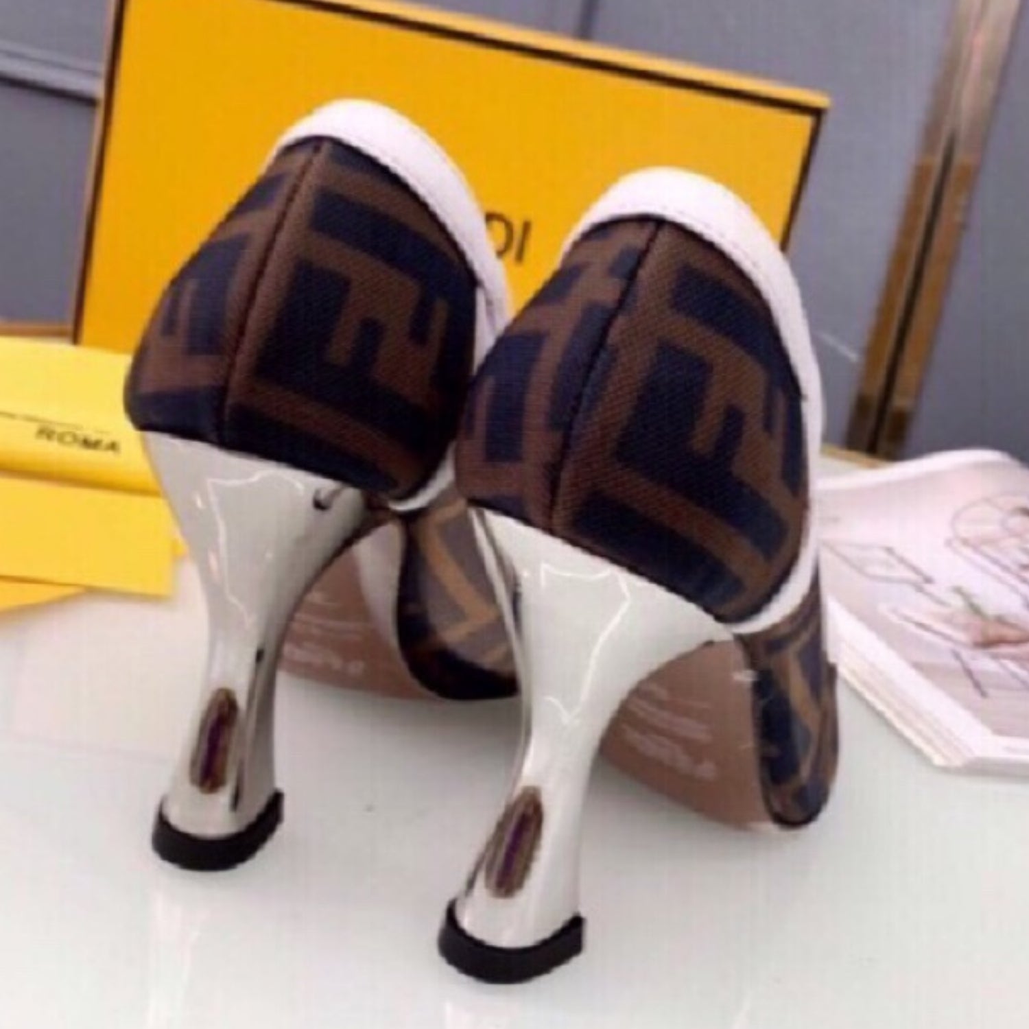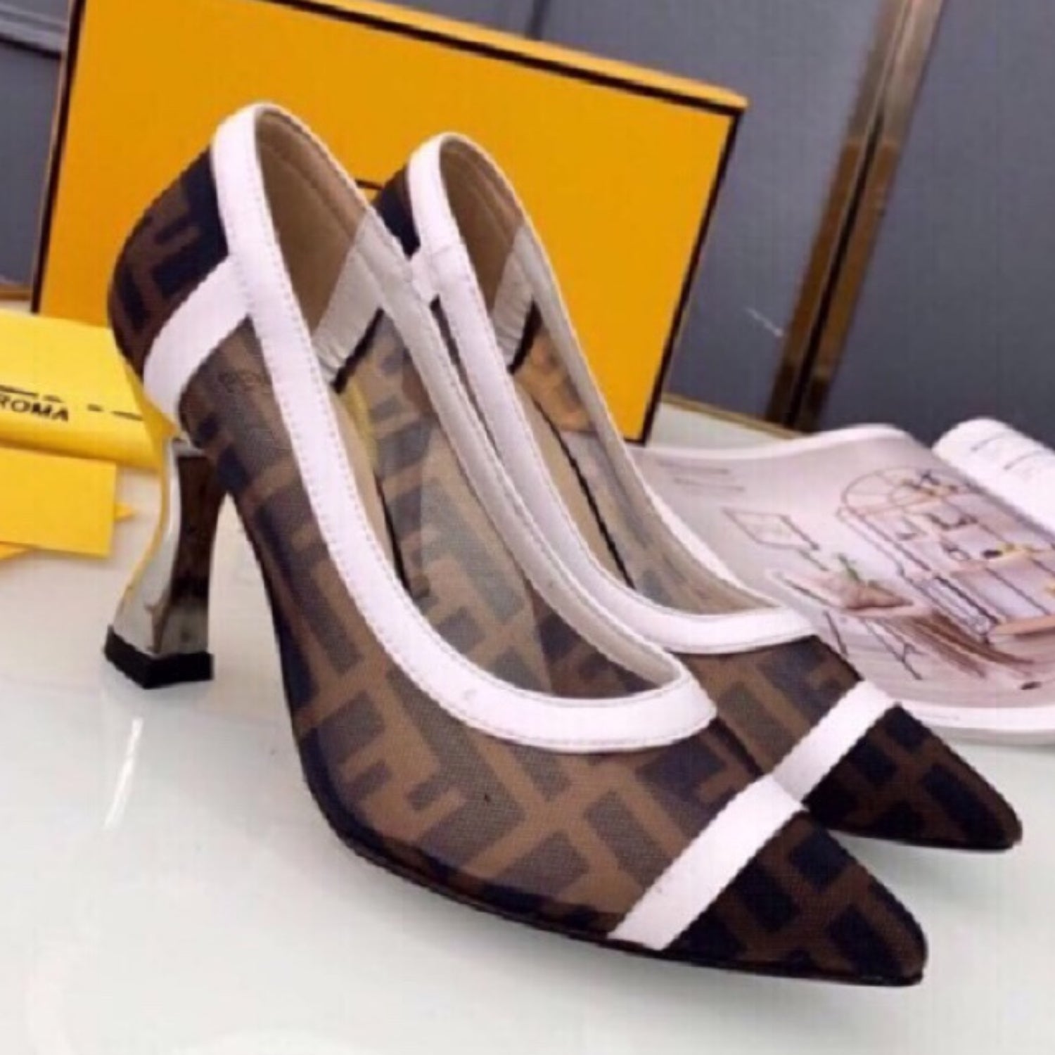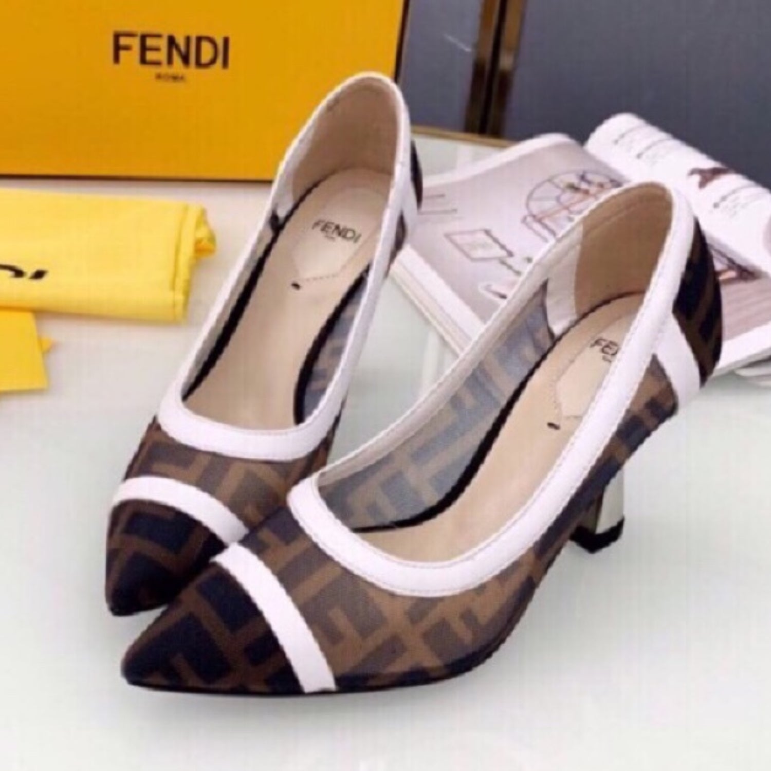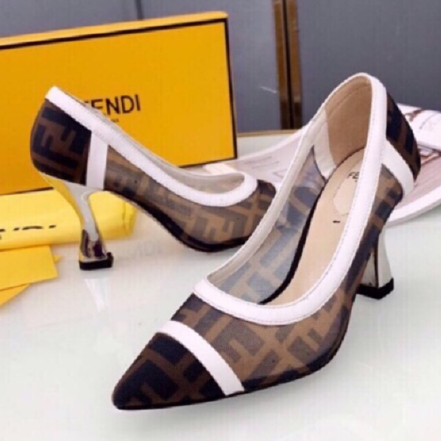 Scarpin FND Canvas com branco e preto couro e salto 8cm