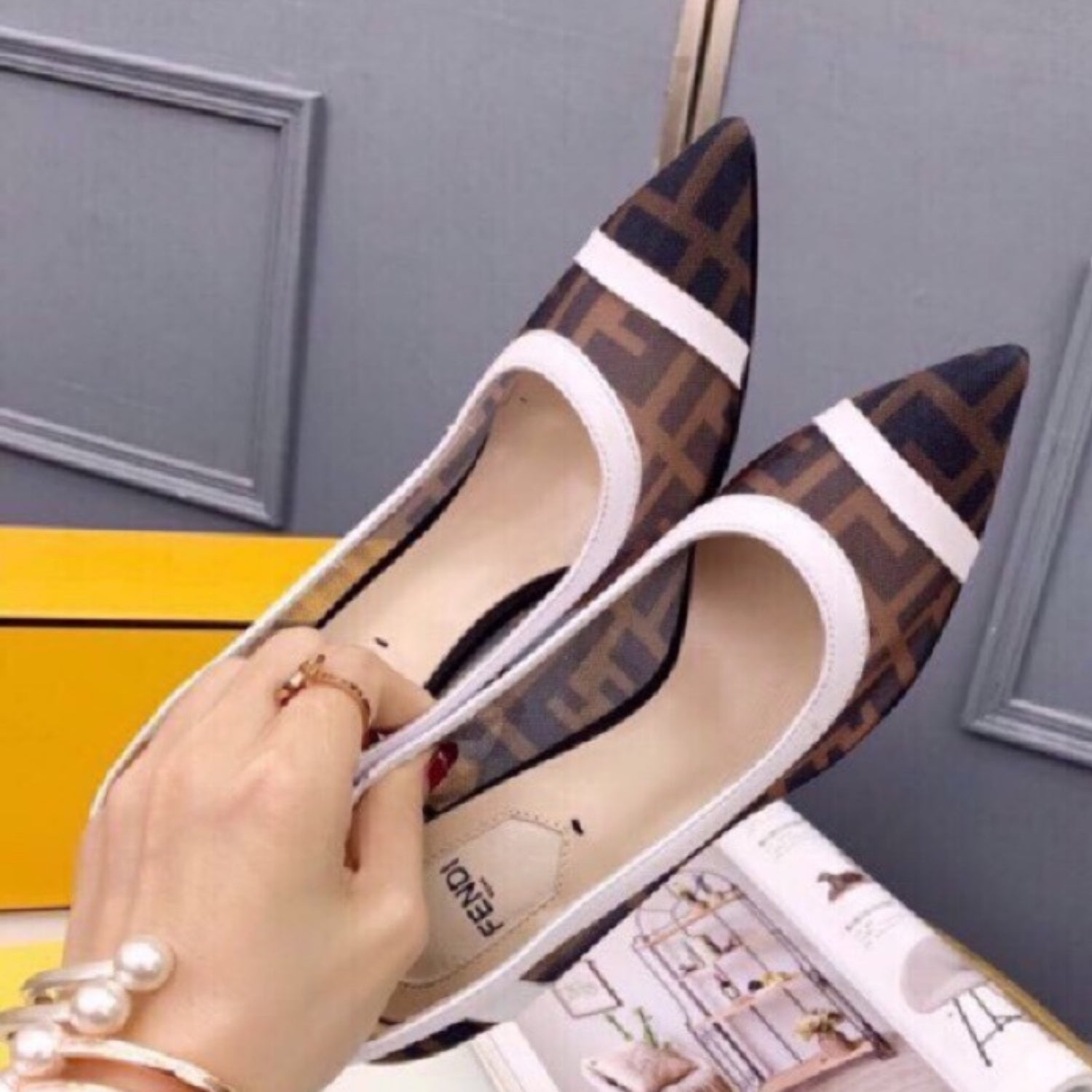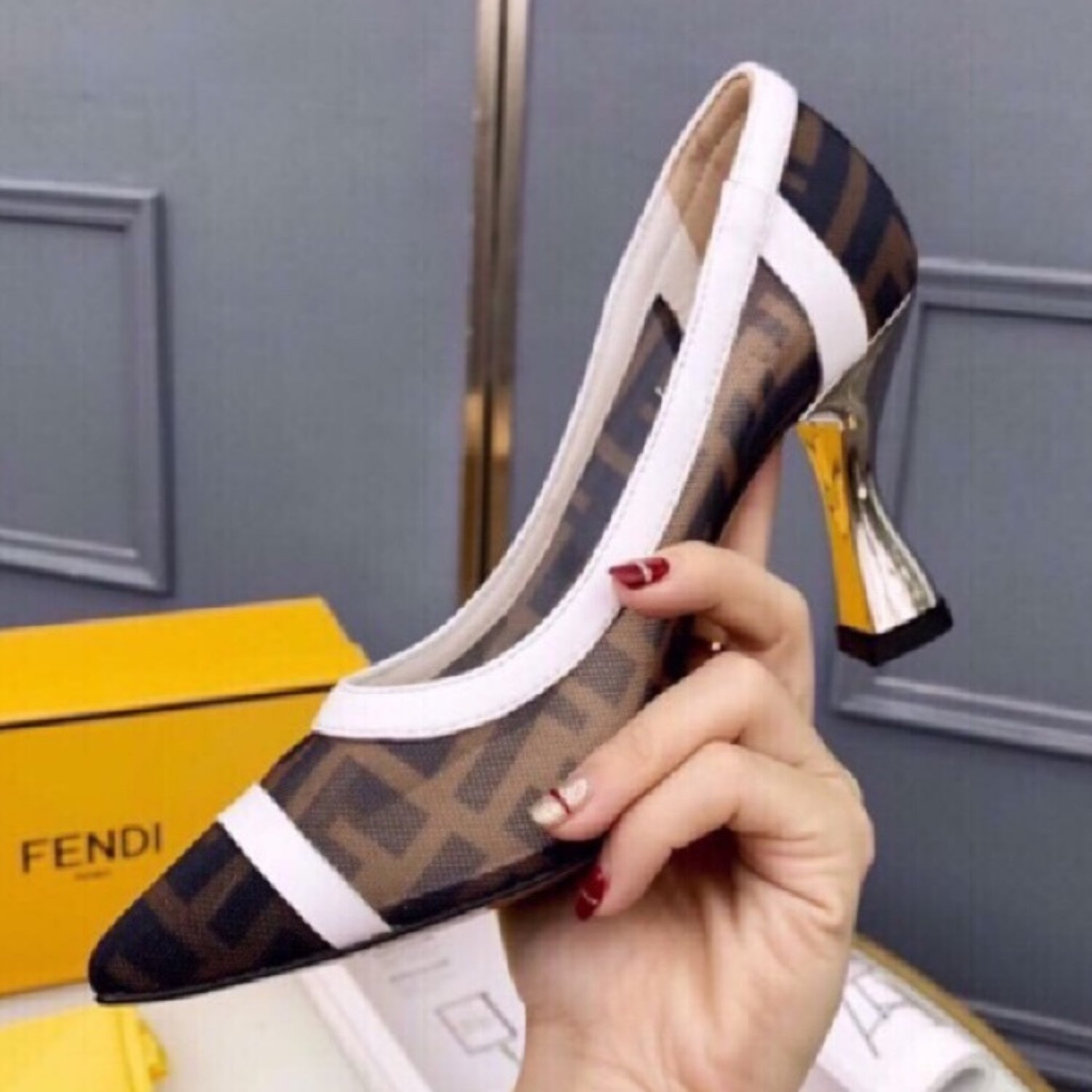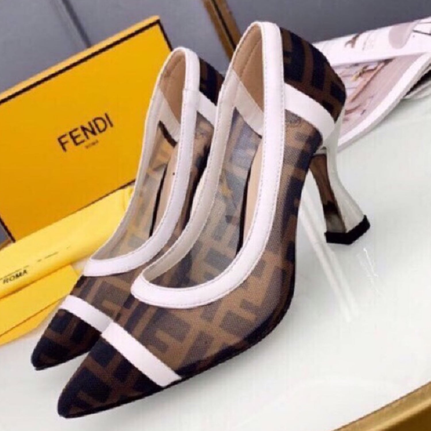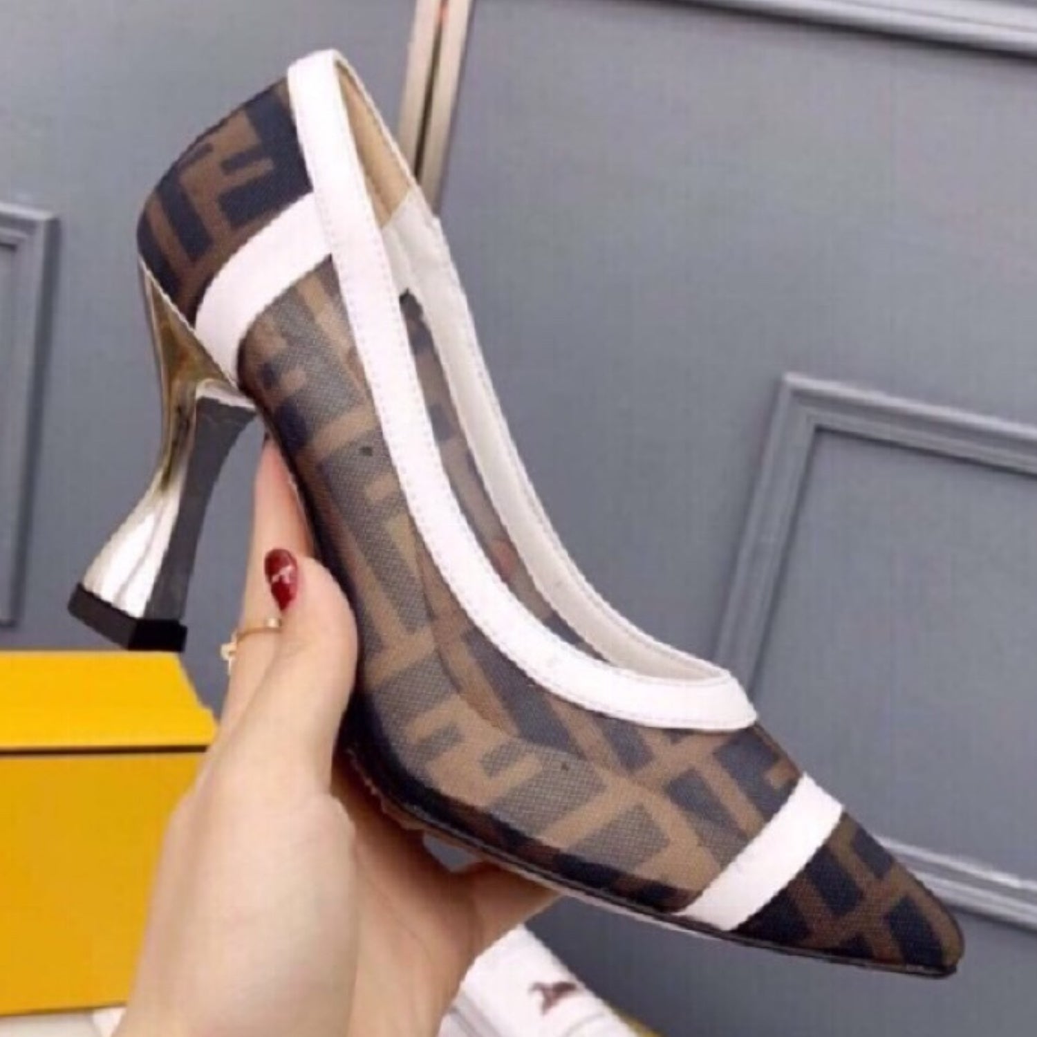 Scarpin FND Canvas com branco e preto couro e salto 8cm